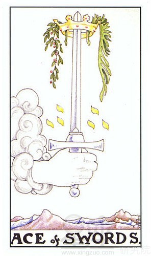宝剑王牌代表的是一个开始,时涉及以相信冒险或方案的行动。权杖王牌描述身体上的行动,杯子牌的王牌则是情感上的行动,而这张王牌叙述一个意念的形成,或是为未来的行动所准备的计划。这张牌代表清晰的思考,或明确的了解...