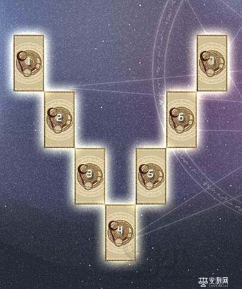2、切实牌后,将最上面的第一张到第七张取同,依图示的位置放好。要小心,不要把牌的上下方向弄颠倒!